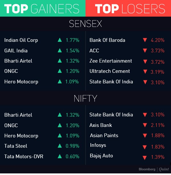 Bank of Baroda (-3.7 percent) and State Bank of India (-3.2 percent) led declines among lenders after credit ratings company Crisil Ltd. said the central bank may increase provisioning on the top 50 non-performing loans by an extra 25 percent in the current fiscal year.