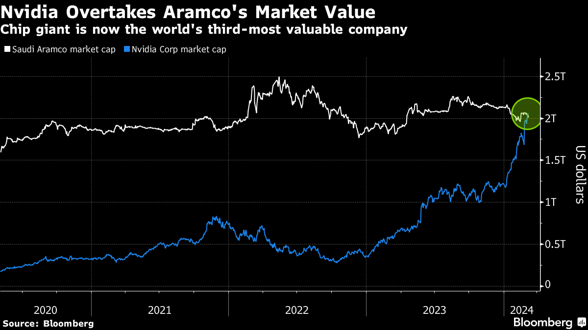 (Bloomberg) -- Nvidia Corp. has claimed another milestone by overtaking Saudi Aramco in market value, making the chipmaker the world's third-most valuable public company after Apple Inc. and Microsoft Corp.