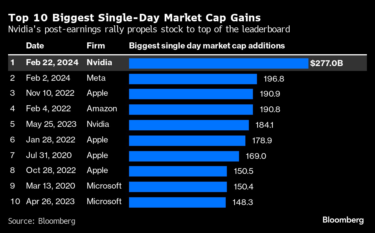 (Bloomberg) -- Nvidia Corp.'s surge to an all-time high is the biggest single-session increase in market value in history, besting Meta Platforms Inc.'s historic gain just three weeks ago.