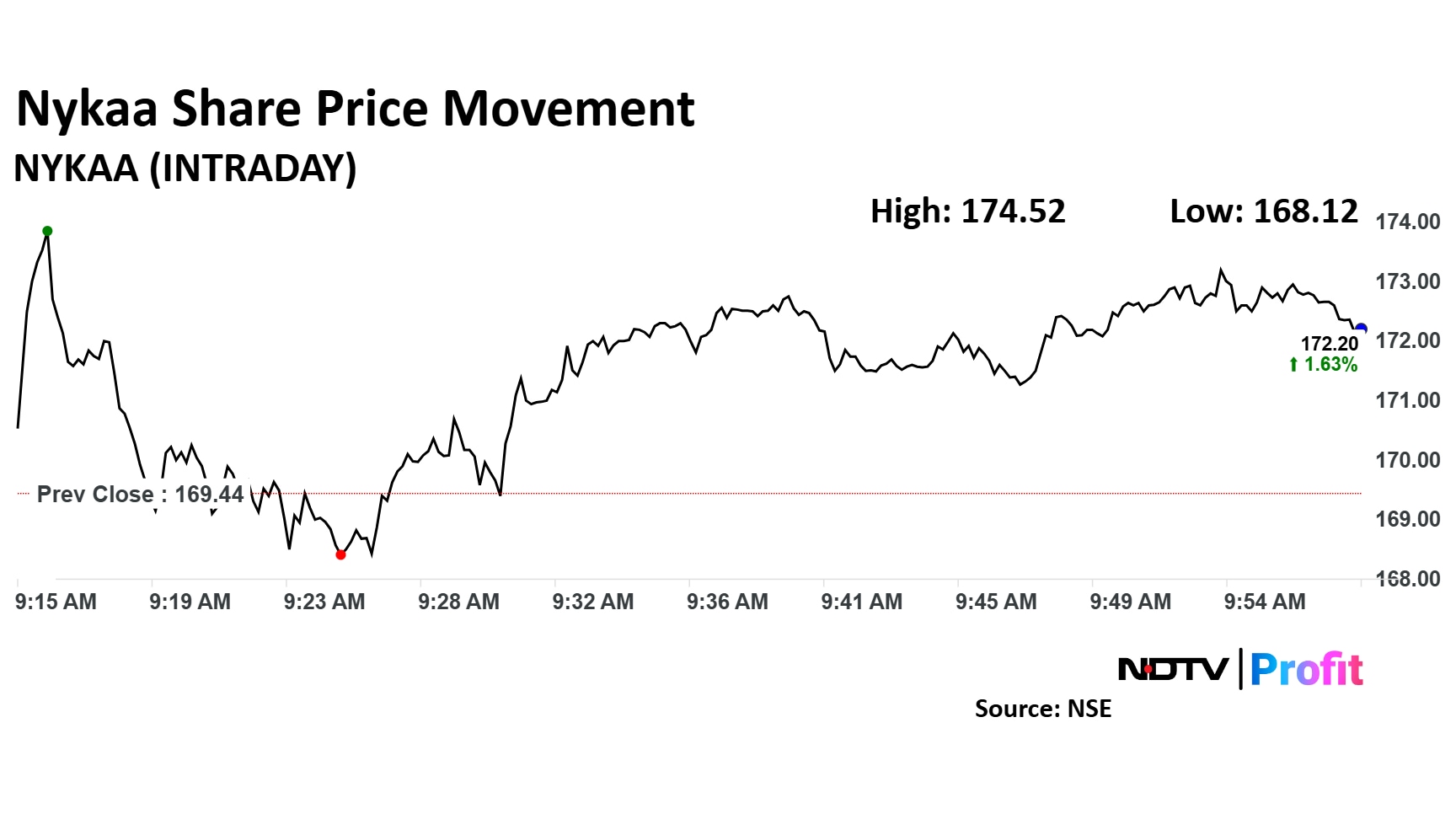 Nykaa's share price advanced as much as 3% intraday to Rs 174.52 apiece on the NSE. It was trading 1.6% higher at Rs 172.2 by 10:00 a.m. The benchmark Nifty 50 was down 0.35%.