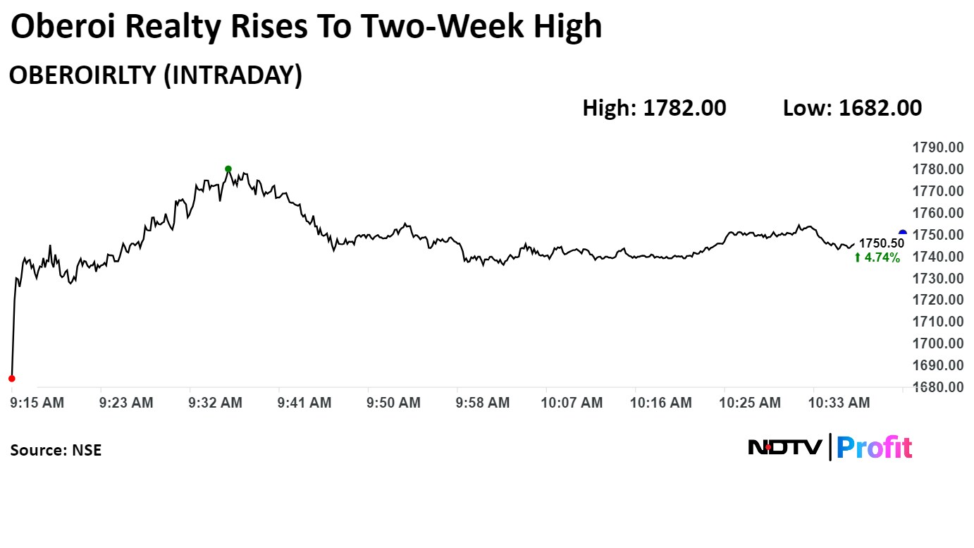 Shares of Oberoi Realty rose as much as 6.62% to Rs 1,782.00, the highest level since July 8. It was trading 4.64% higher at Rs 1,748.80 apiece, compared with 0.12% gains in the benchmark BSE Sensex.