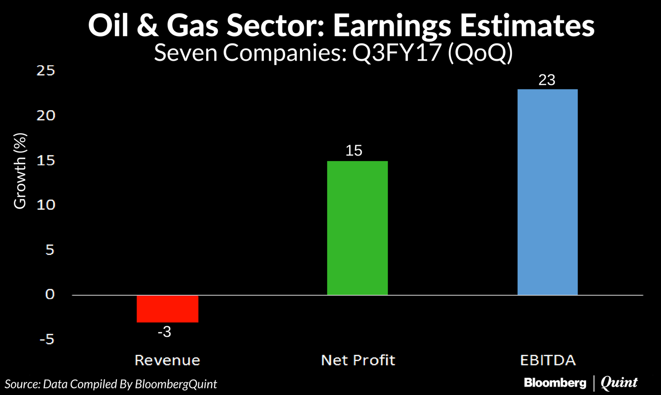 For the December ended quarter, the seven oil and gas firms are expected to report a three percent decline in revenue on a quarter-on-quarter basis. Net profit is expected to rise 15 percent, and the earnings before interest, depreciation and amortisation (EBITDA) may increase by 23 percent, according to Bloomberg consensus estimates.