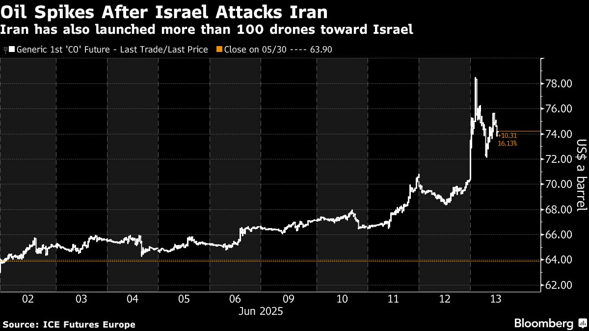 Oil surged as much as 14% after Israel carried out airstrikes against Iran, raising fears of a wider war in a region that accounts for a third of global crude production.