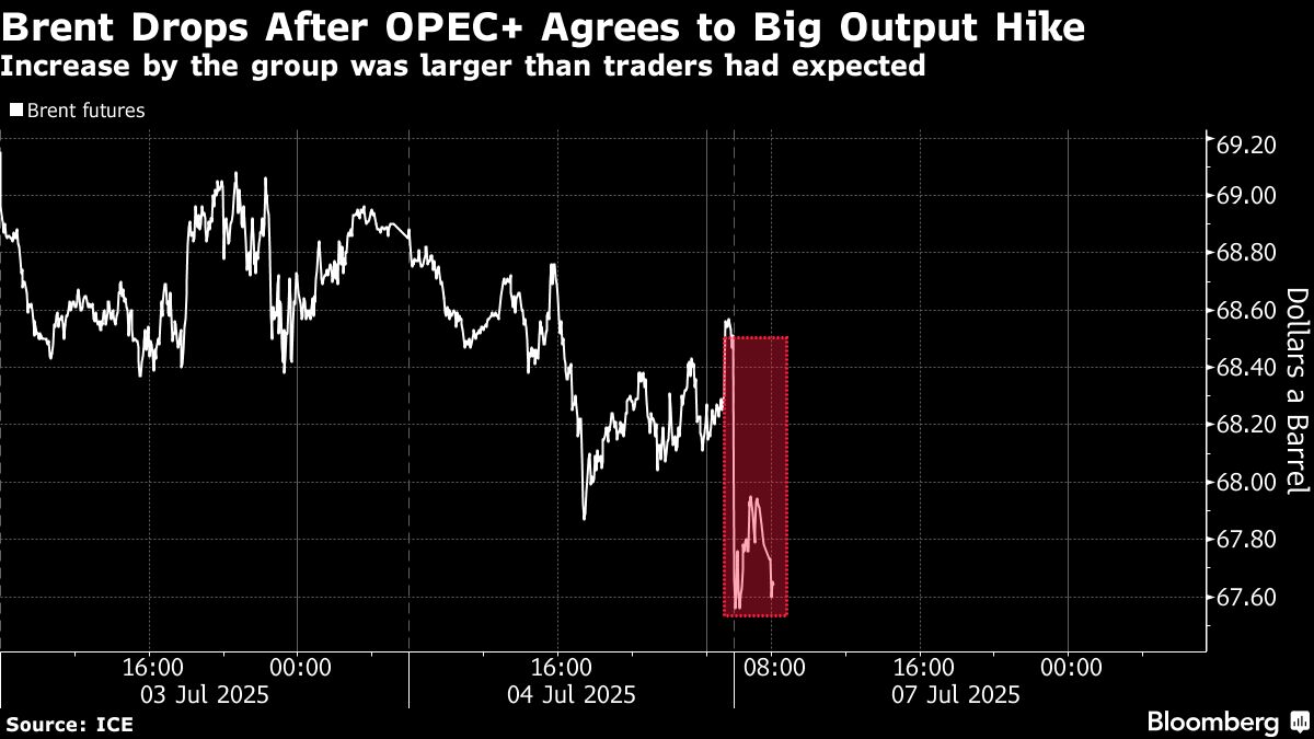 Oil extended declines after OPEC+ agreed to a bigger-than-expected production increase next month, raising concerns about oversupply just as US tariffs fan fears about the demand outlook.