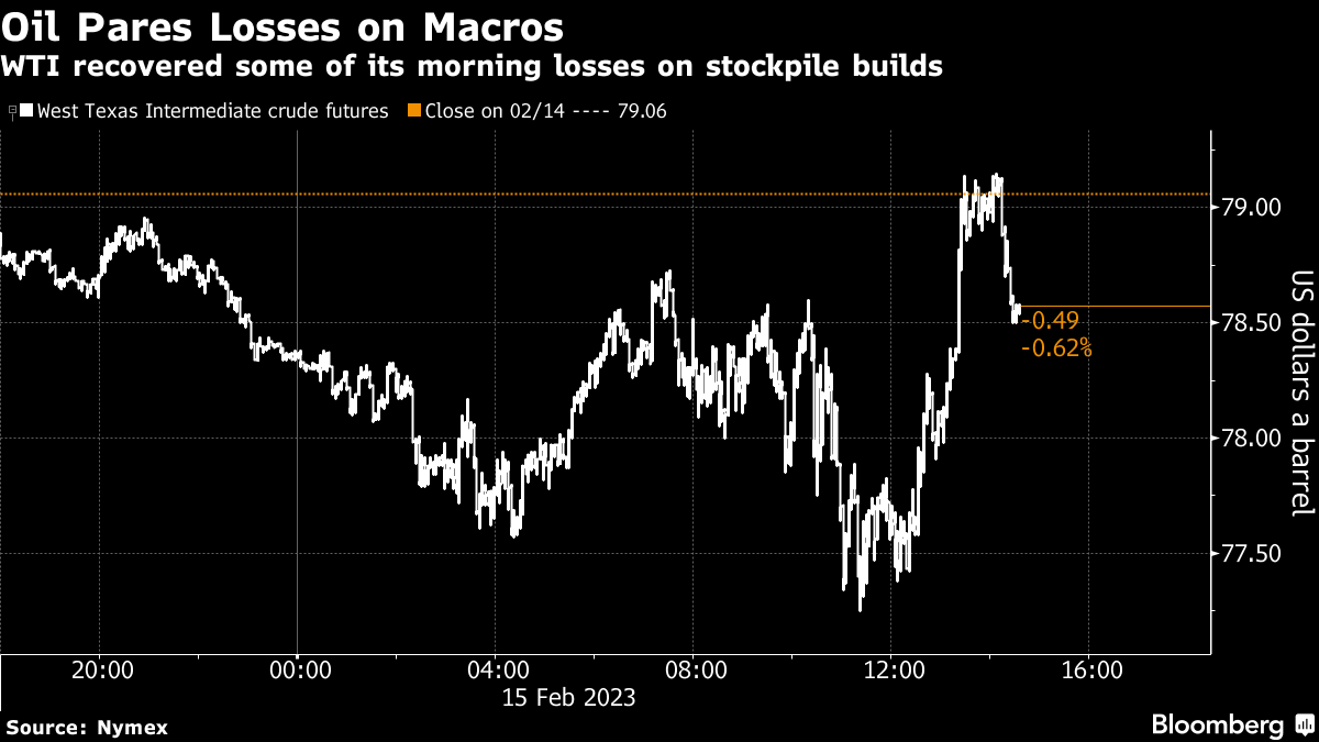 West Texas Intermediate pared sharp losses following US data that showed total crude inventories rose to their highest since the summer of 2021. The International Energy Agency boosted its forecast Wednesday for global oil demand this year as China reopens its economy, echoing OPEC's tighter outlook from the day before. Meanwhile, a robust dollar was pressuring almost all commodities lower, capping bulls' ability to break out.