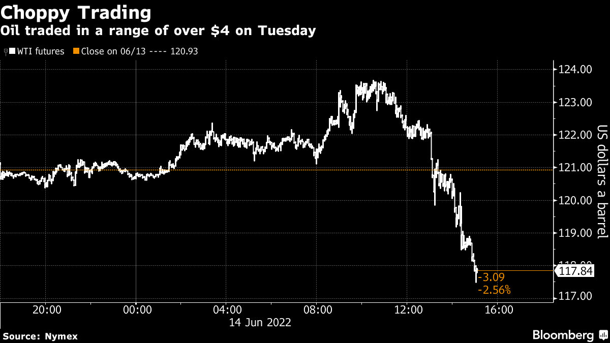 West Texas Intermediate erased all of its gains late in the session to settle below $119 a barrel. US President Biden has not ruled out an excess profit tax for oil companies, Bharat Ramamurti, deputy director of the National Economic Council, said in a Bloomberg Television interview. Democratic Senator Ron Wyden is planning to propose a surtax that would mean companies face as much as 42% federal taxes depending on their profit margin, according to people briefed on the proposal.