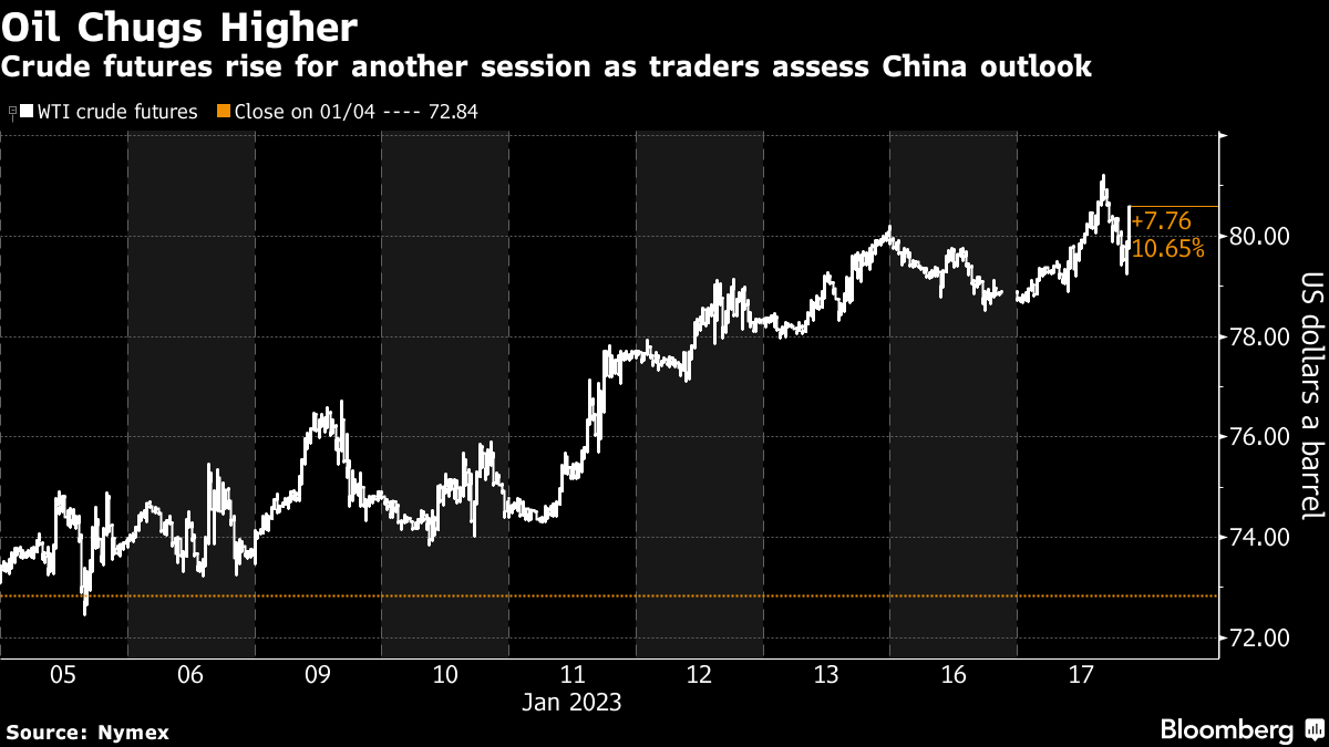 Crude has had a rocky start to 2023, sinking in the opening week on concerns over a global slowdown, before rebounding. Aside from China, oil has found support from a weakening dollar and growing expectations that the Federal Reserve is nearing an end to its aggressive series of interest-rate hikes. Meanwhile, Saudi Arabia floated the idea of trading crude in currencies other than the US dollar.