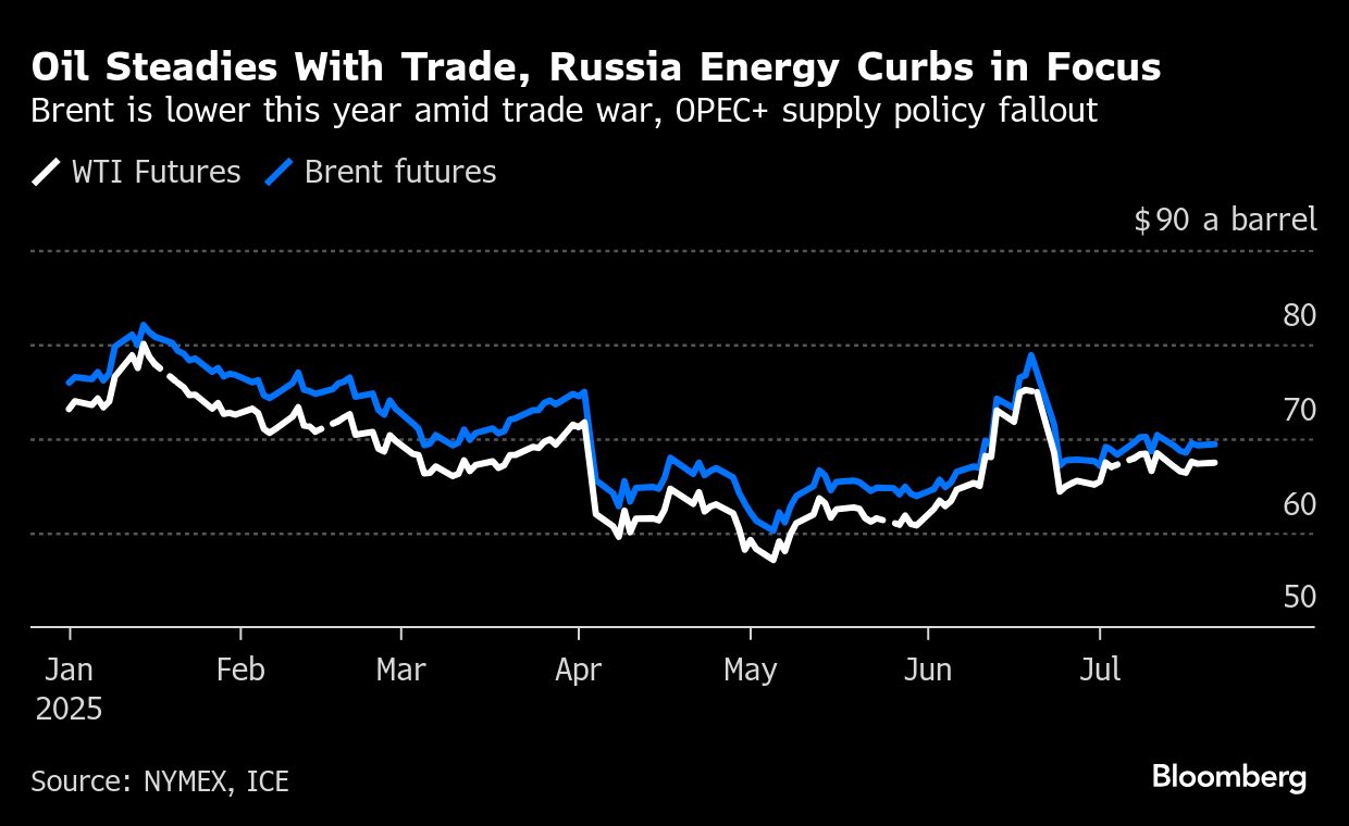 Brent crude traded near $69 a barrel after falling 1.5% last week. EU envoys are set to meet as early as this week to formulate a plan to respond to a possible no-deal scenario with US President Donald Trump, whose position is seen to have stiffened ahead of an Aug. 1 deadline.