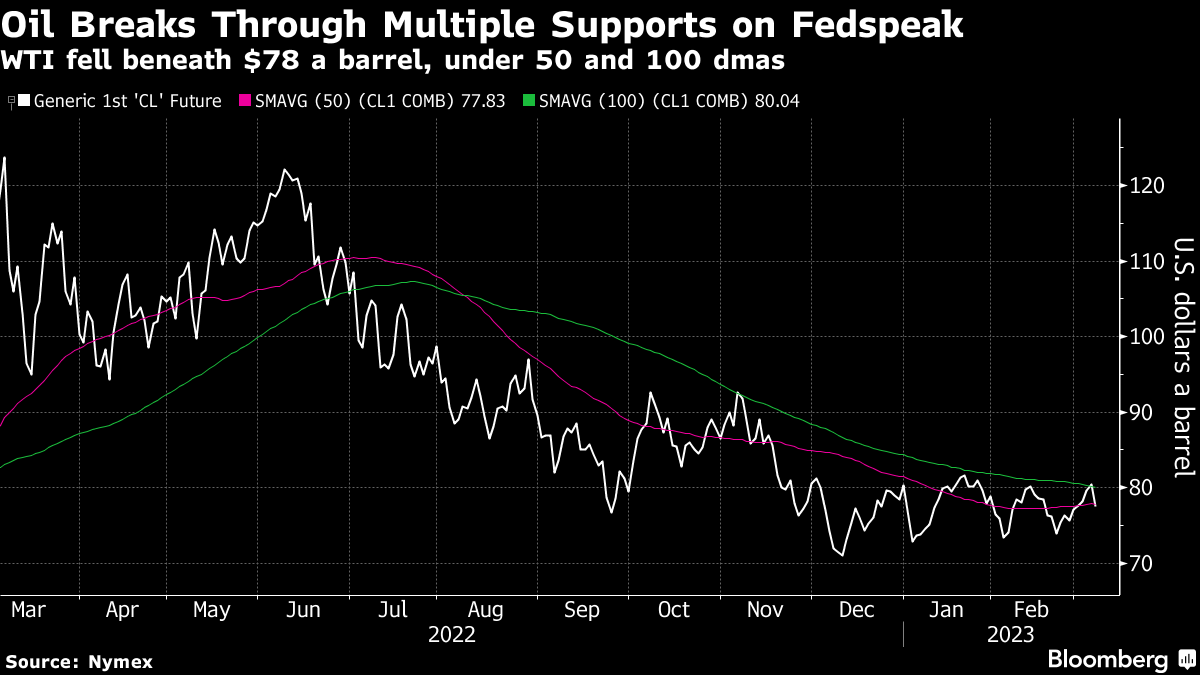 Powell's message that the central bank may raise rates faster than expected — and to a higher endpoint — bolstered a bear case built on swelling US stockpiles and a weaker-than-expected economic growth target from China. His message broke a five-day rally for West Texas Intermediate and pushed crude below its 50- and 100- day moving averages.