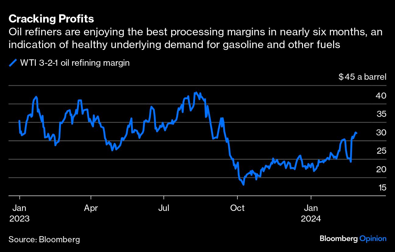 Inside the cartel, I hear there's a strong view that “market conditions” don't warrant more barrels right now. Oil prices, even if stronger than in late 2023, aren't yet high enough to justify pumping more, some say. Part of the current market strength could also be a mirage, the thinking goes. In January, several disruptions, including cold US weather, reduced global supply, leading to larger-than-expected stock drawdowns. But that oil is coming back now. Moreover, refinery maintenance season is around the corner, reducing the need for oil, particularly during April.