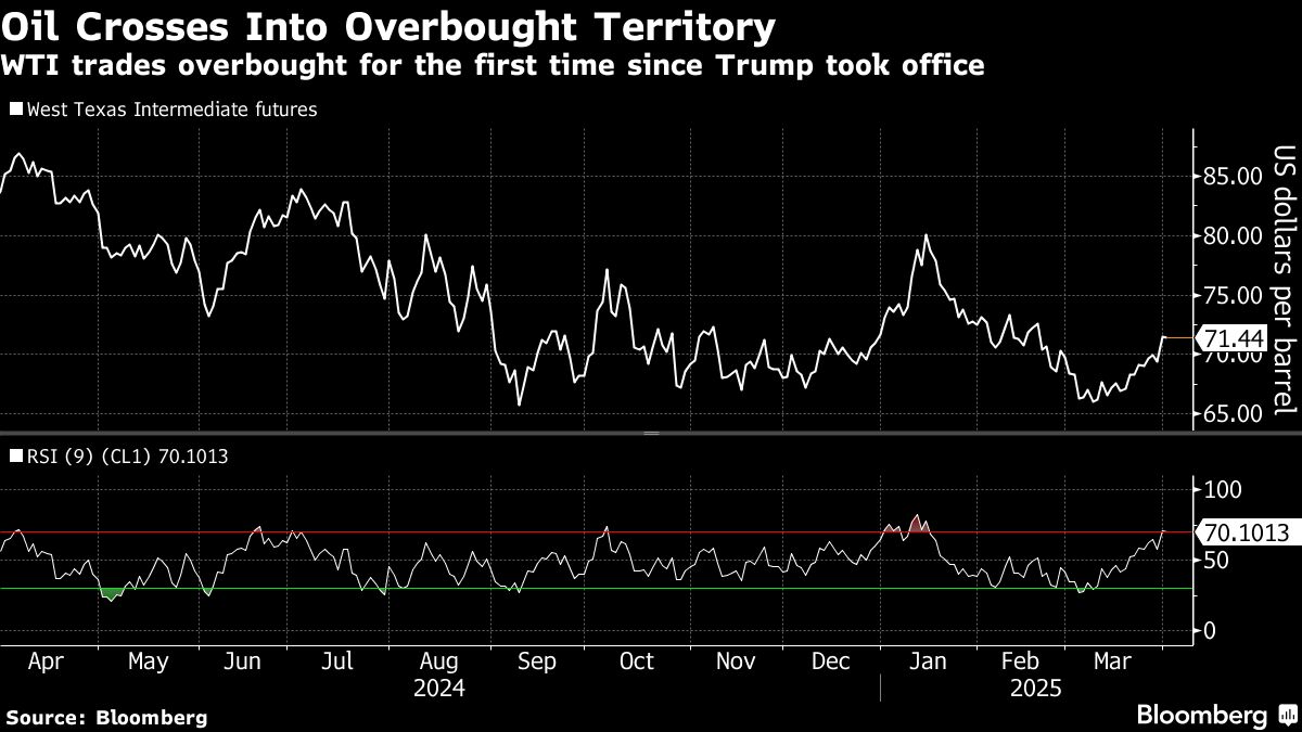 Trump's threat of penalties on Russia has added to a more positive short-term outlook for prices, with key timespreads pointing to a tighter market and derivatives tied to the vital North Sea benchmark surging. At the same time, WTI entered overbought territory on its nine-day relative strength index for the first time since Trump took office, signaling that the past three weeks' rally may be set to pause.
