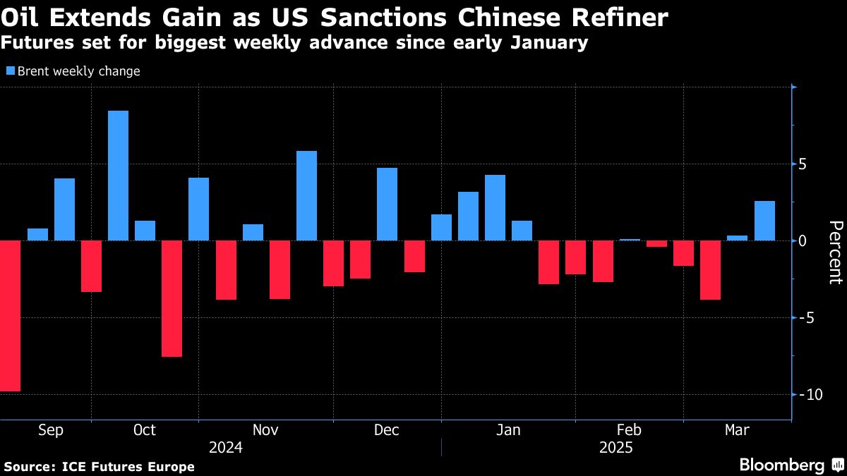 Oil climbed a third day after the US sanctioned a Chinese refinery for the first time, in a marked step-up of measures to curb supply from Iran.