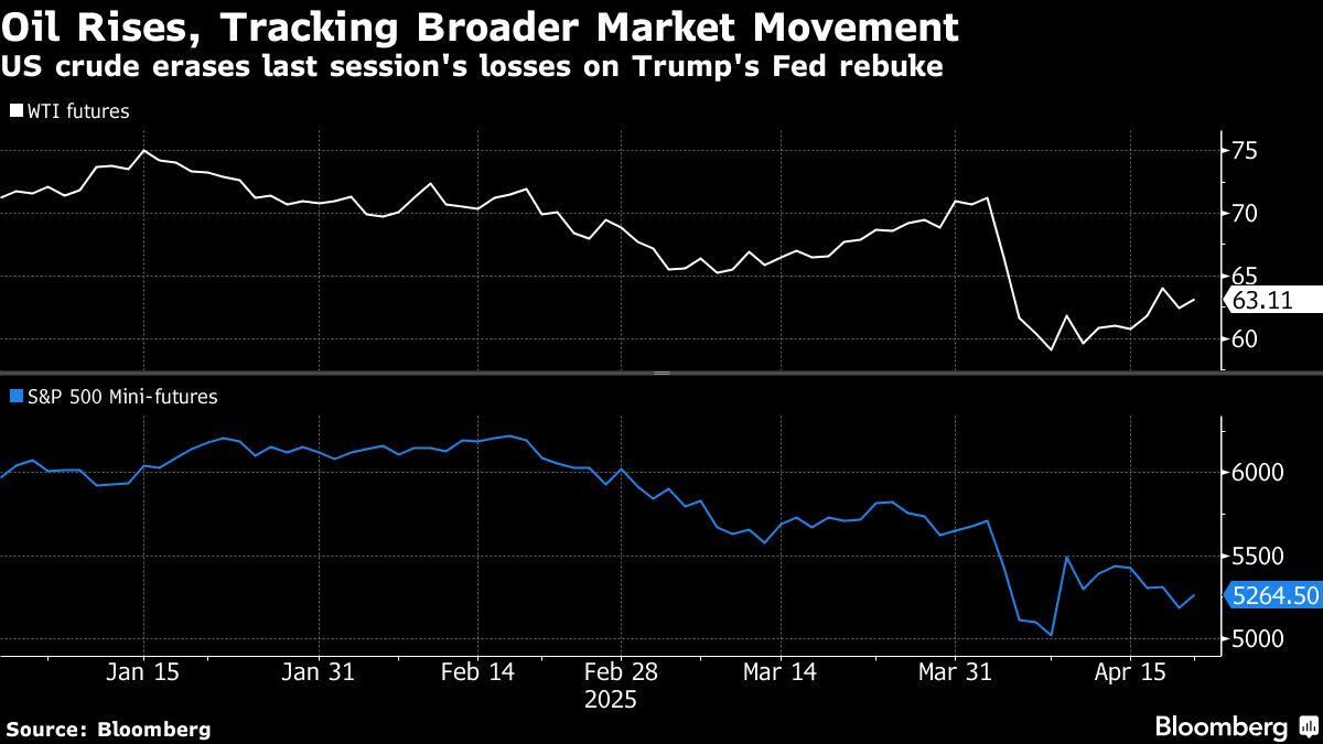 Oil rose as broader markets rebounded from a plunge on Monday that was driven by US President Donald Trump's escalating criticism of Federal Reserve Chair Jerome Powell.