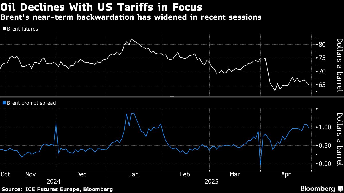 Brent slipped below $65 a barrel, down for a second day, with West Texas Intermediate near $61. A widely referenced gauge of US manufacturing weakened significantly, another sign of the drag from President Donald Trump's levies. Other data due this week will shed further light on trading conditions.