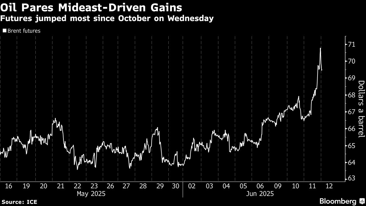 Brent fell toward $69 a barrel after rising the most since October in the previous session, while West Texas Intermediate was near $68. Crude shot higher after Iran threatened to strike US bases in the region if talks over its nuclear program fell through. The US ordered some staff to depart the embassy in Iraq, and allowed military service members' families to leave the Middle East.