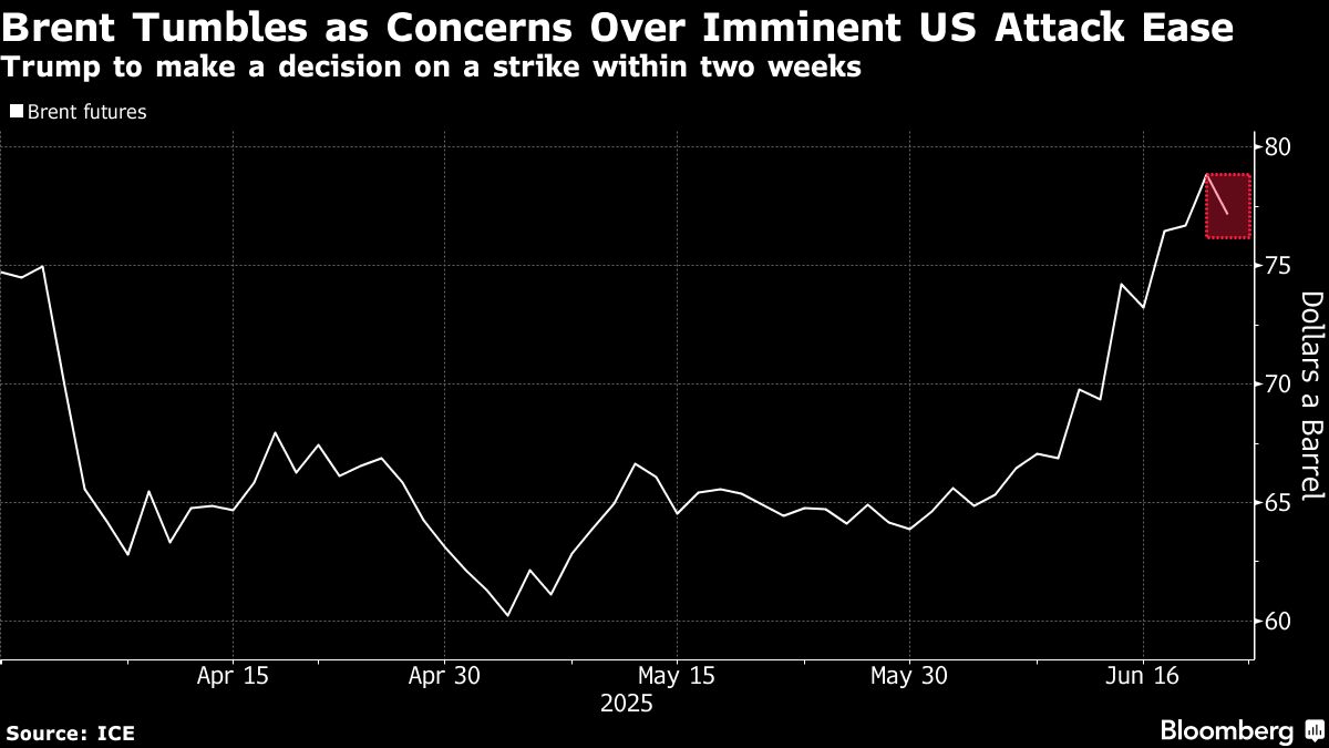 Brent tumbled as much as 2.7% to trade below $77 a barrel, before clawing back some losses. White House spokeswoman Karoline Leavitt said that the decision would take some time due to the “substantial chance of negotiations” with Iran, according to a dictated message from Trump. She declined to elaborate on the timeline, including on how he views the chances of success of any talks.