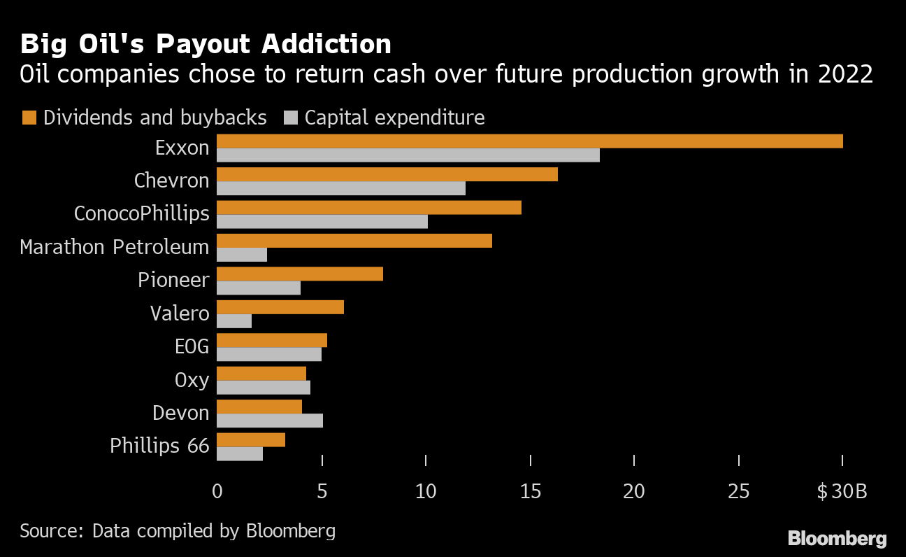 For the first time in at least a decade, US drillers last year spent more on share buybacks and dividends than on capital projects, according to Bloomberg calculations. The $128 billion in combined payouts across 26 companies also is the most since at least 2012, and they happened in a year when US President Joe Biden unsuccessfully appealed to the industry to lift production and relieve surging fuel prices. For Big Oil, rejecting the direct requests of the US government may never have been more profitable.