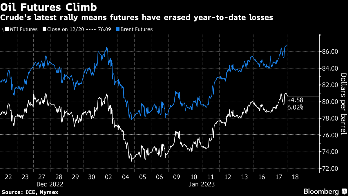 West Texas Intermediate climbed above $81 a barrel, building on a modest gain on Tuesday and last week's jump of more than 8%. While global oil markets are set to face a bigger surplus than expected in the first quarter, they will tighten in the second half, the International Energy Agency said in its latest outlook. Average demand is also poised for a record this year.