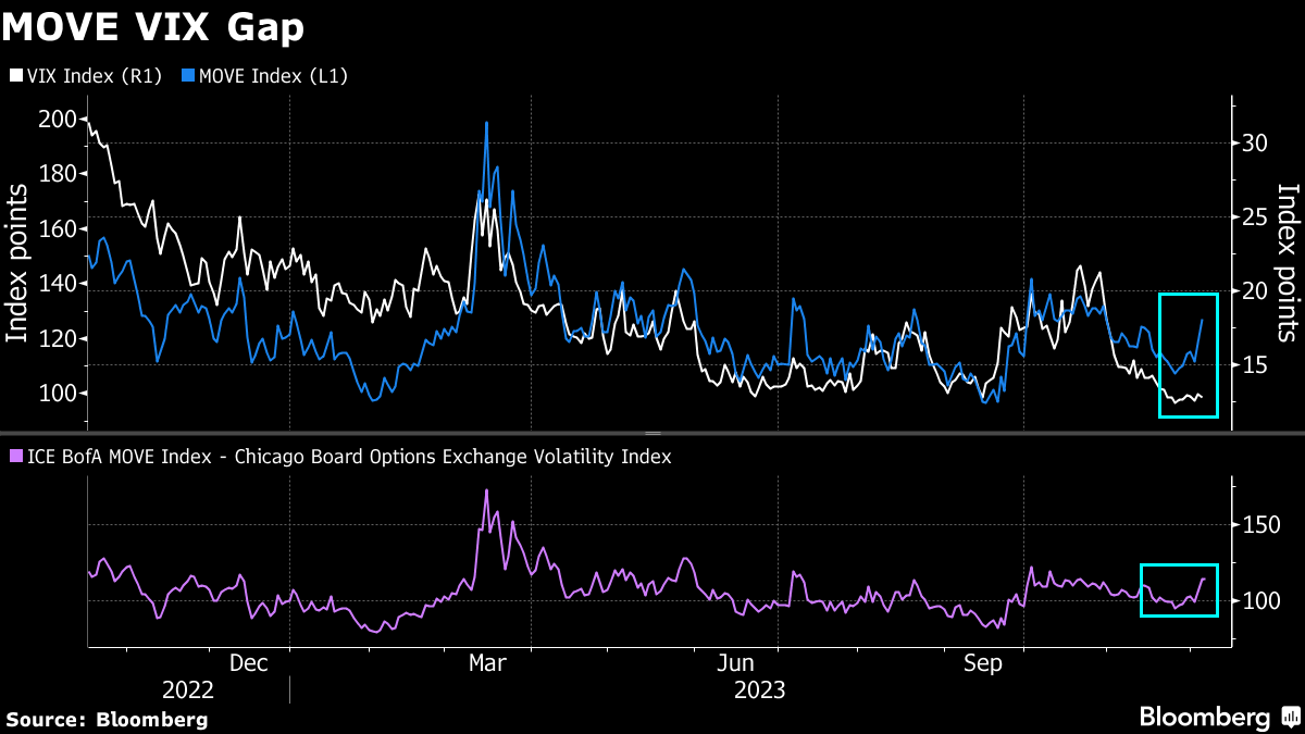 Easing rate expectations played a big part in November's stocks rally, yet a reading of cross-asset volatility shows risks aren't as muted as they may appear. The gap between the MOVE Index, which tracks interest-rate volatility, and the VIX gauge of stock price swings has once again widened, suggesting rate markets remain choppy and could spark stress for equities at any time.