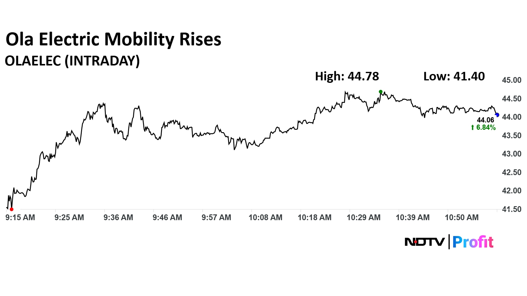 Ola Electric Mobility share price jumped 8.58% to Rs 44.78 apiece, the highest level since July 24. It was trading 7.25% higher at Rs 44.16 apiece as of 11:02 a.m., which implied 0.21% advance in the NSE Nifty 50 index.