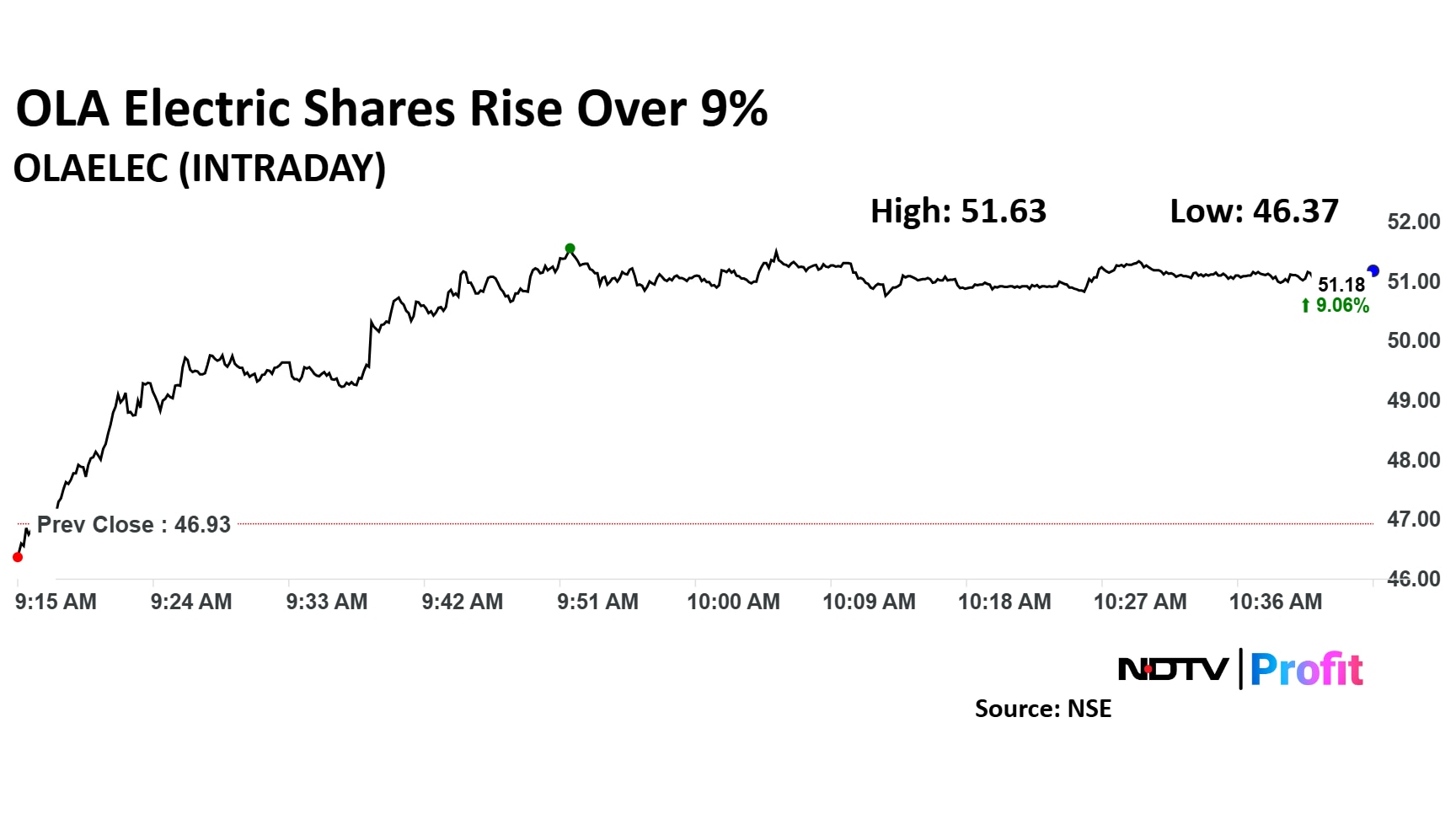 Ola stock rose as much as 10.01% during the day to Rs 51.6 apiece on the NSE. It was trading 8.86% higher at Rs 51.09 apiece, compared to a 1.15% advance in the benchmark Nifty 50 as of 10:48 a.m.