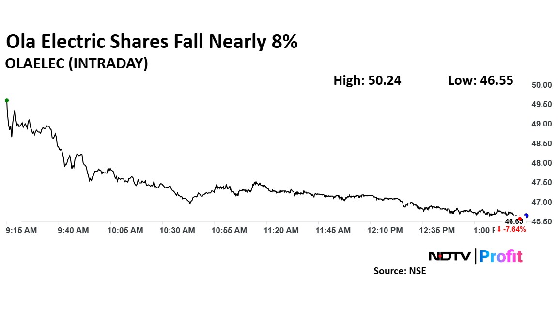 The shares of Ola Electric fell as much as 7.92% to Rs 46.51 apiece to hit fresh all-time low. The stock pared losses to trade 7.68% lower at Rs 46.63 apiece, as of 1:31 p.m. This compares to a 0.42% advance in the NSE Nifty 50 Index.