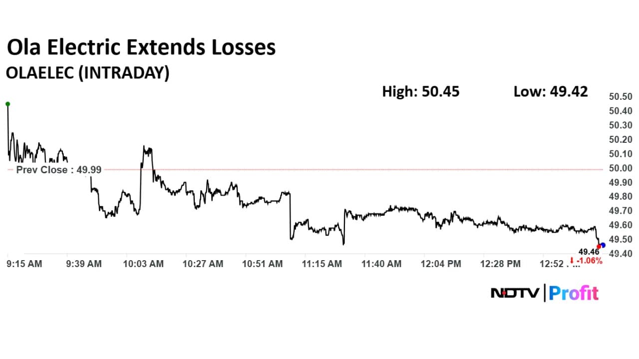 The shares of Ola Electric fell as much as 1.84% to Rs 49.07 apiece, the lowest level since June 4. It pared losses to trade 1.58% lower at Rs 49.20 apiece, as of 1:35 p.m. This compares to a 0.46% advance in the NSE Nifty 50 Index.
