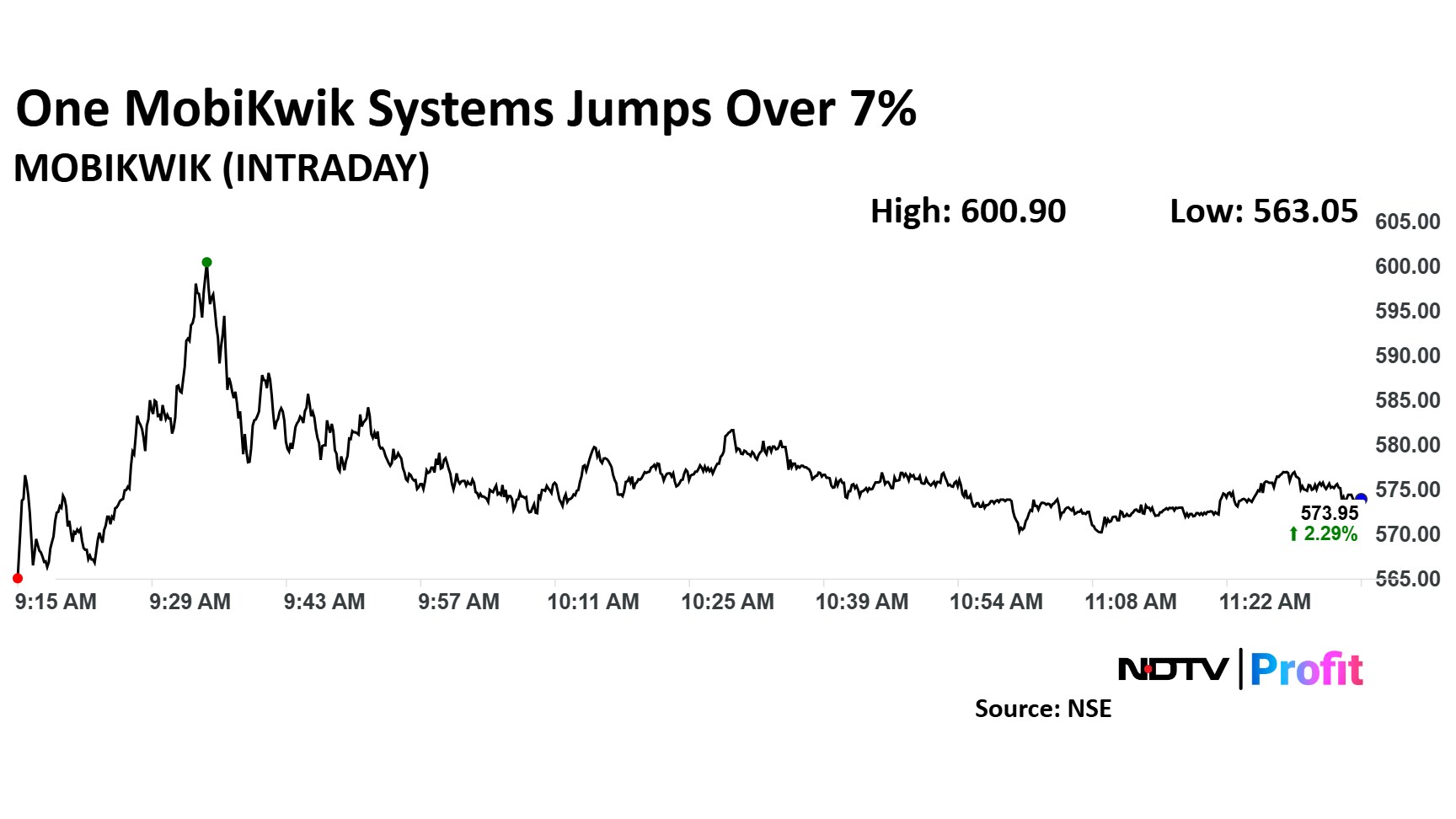One MobiKwik Systems share price rose 7.09% to Rs 600.90 apiece. It was trading 2.26% higher at Rs 573.80 apiece as of 11:38 a.m., as compared to 0.60% advance in the NSE Nifty 50 index.