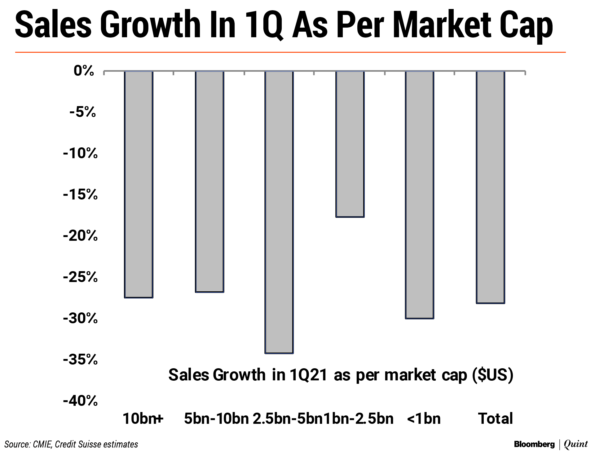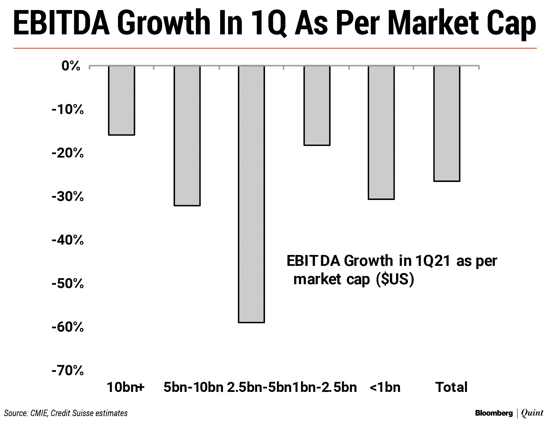 The earnings before interest and tax for large (more than $5-billion market cap), mid-sized ($1-5 billion) and small firms (less than $1 billion) declined 20%, 44% and 31% year-on-year, respectively, during the period, the global research firm said in a report. The EBIT decline for the $2.5-5-billion cohort was 59%.