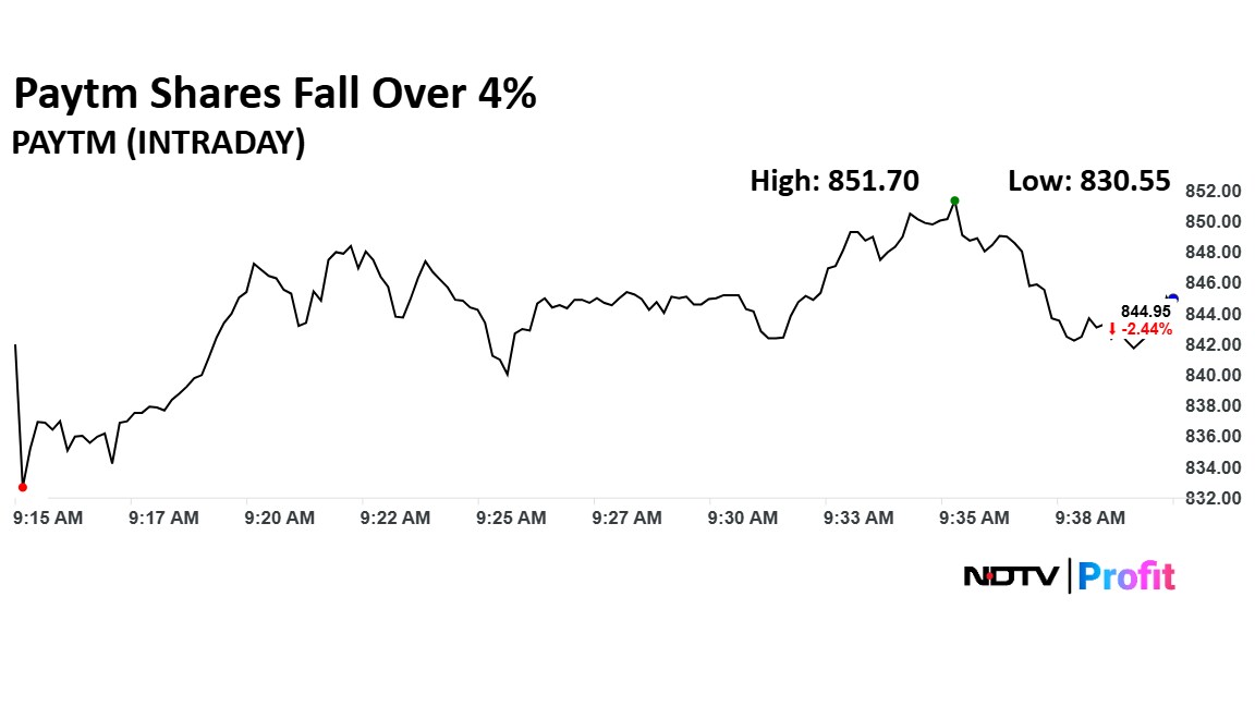 Shares of Paytm fell as much as 4.10% to Rs 830.55 apiece, the lowest level since May 9. It pared losses to trade 2% lower at Rs 849 apiece, as of 9:37 a.m. This compares to a 0.49% decline in the NSE Nifty 50.
