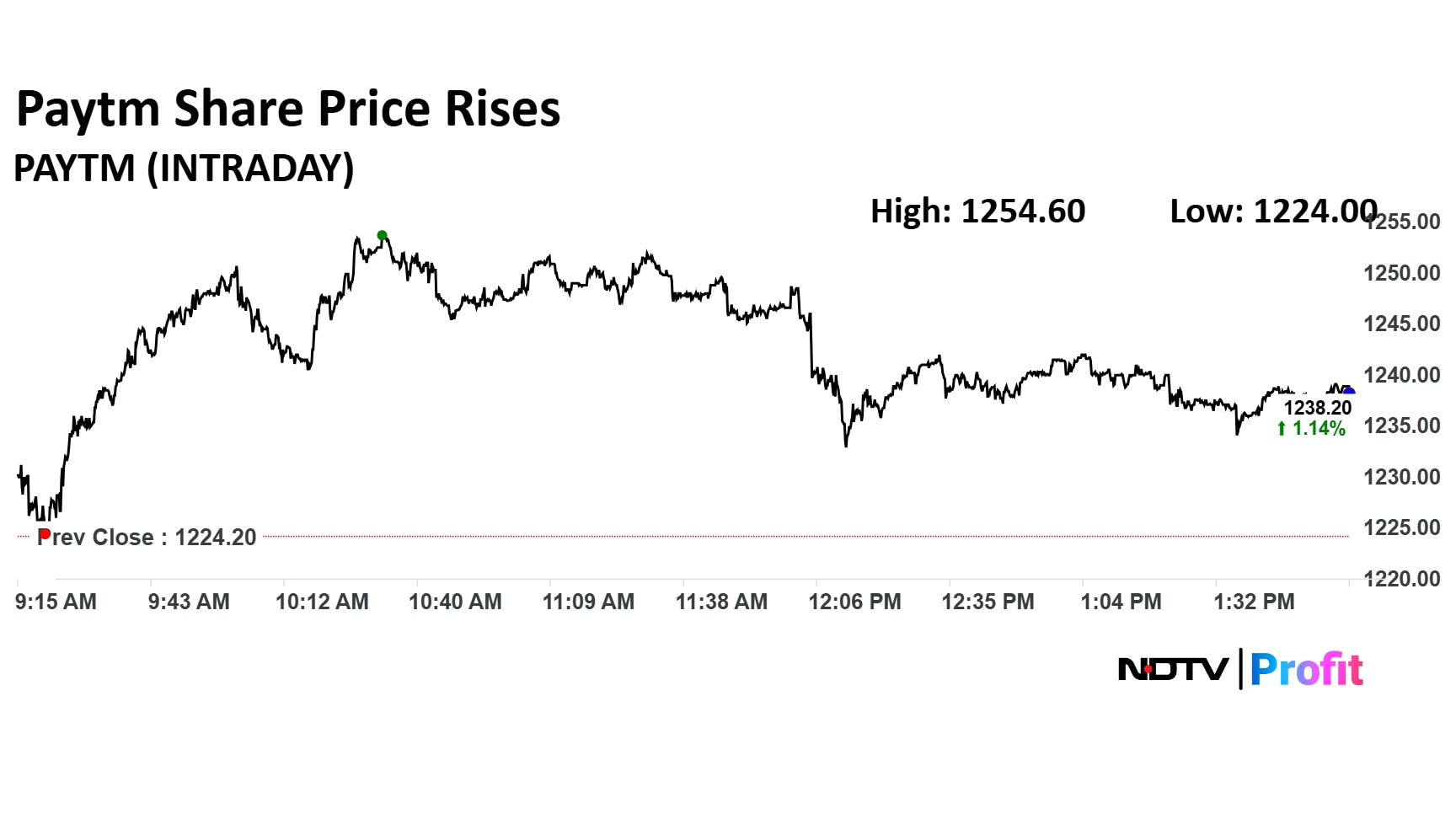 One 97 Communications share price rose 2.48% to Rs 1,254 apiece. It was trading 1.17% higher at Rs 1,238.8 apiece as of 2:02 p.m. as compared to 0.50% advance in the NSE Nifty 50 index.