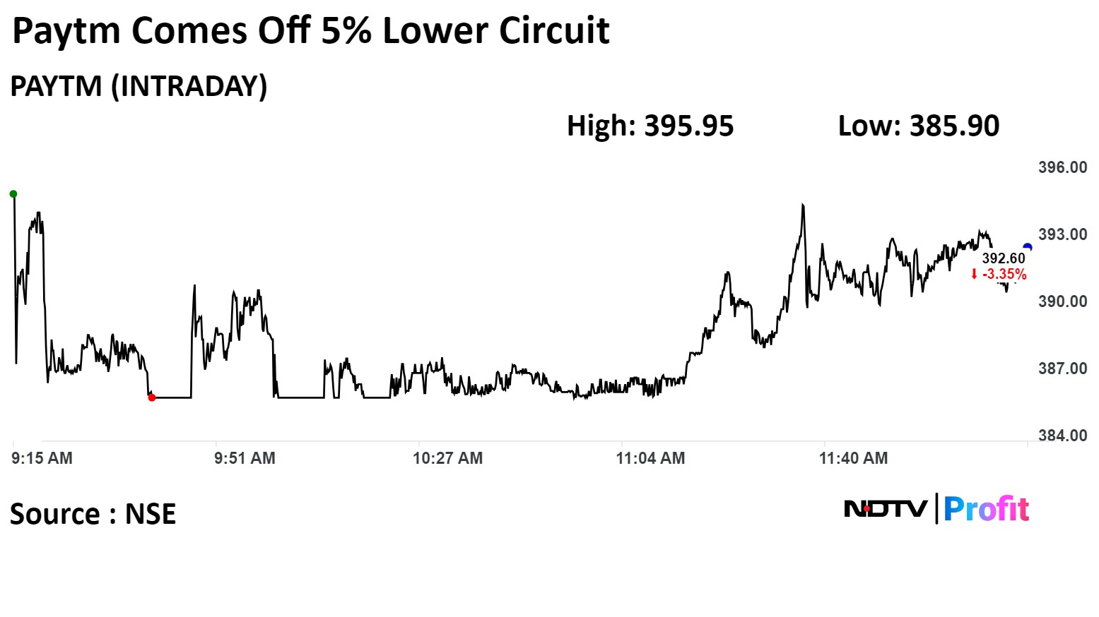 Shares of Paytm hit 5% lower circuit and fell to Rs 385.90 apiece, the lowest level since Feb. 23. It came off the lower circuit to trade 3.48% lower at Rs 392.05 apiece, compared to a 0.15% decline in the NSE Nifty 50 as of 12:33 p.m.