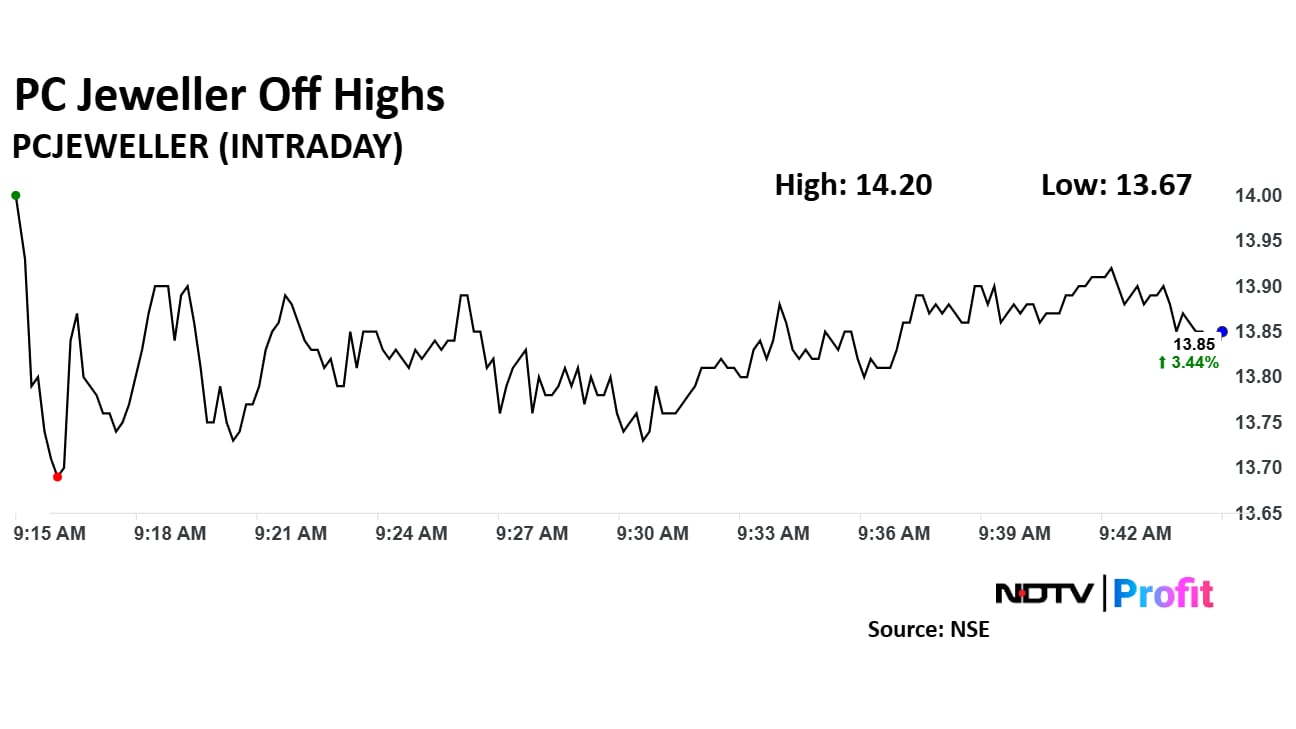 PC Jeweller share price rose 6.05% to Rs 14.20 apiece. It pared some gains to trade 3.44% higher at Rs 13.85 apiece as of 9:48 a.m., as compared to 0.81% advance in the NSE Nifty 50 index.
