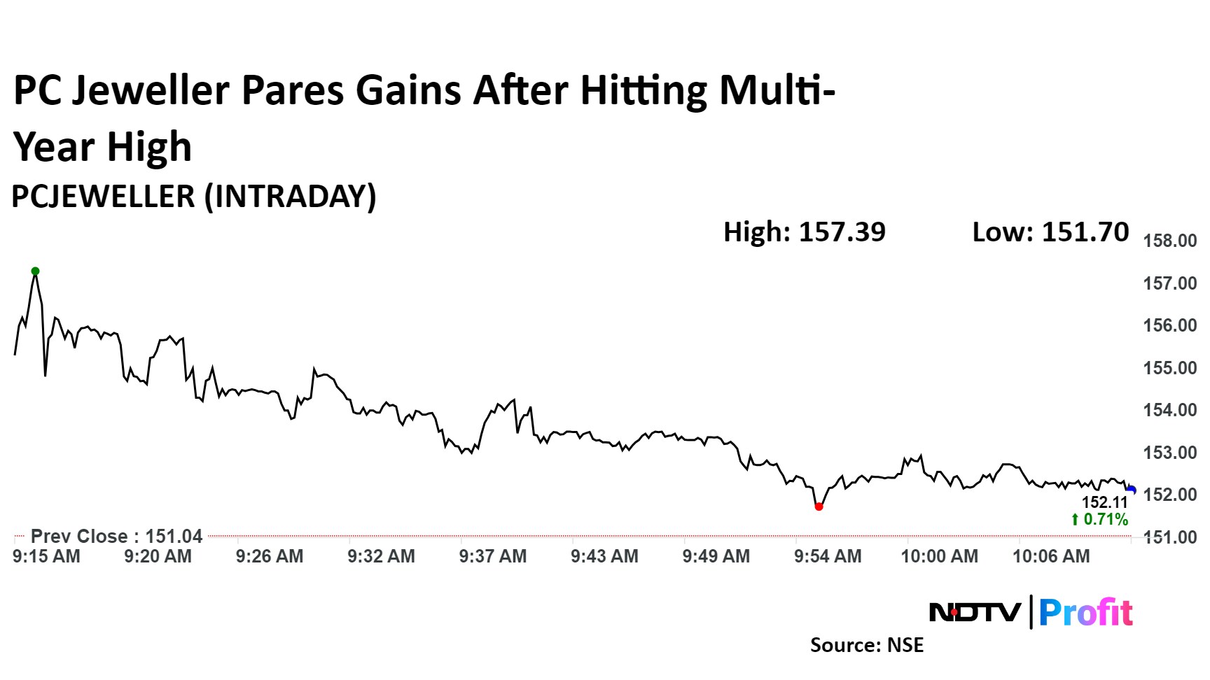 PC Jeweller's stock gained in the fourth consecutive session today to hit Rs 157.39 apiece, its highest level since April 18, 2019. It has gained nearly 10% in the four-day rise.