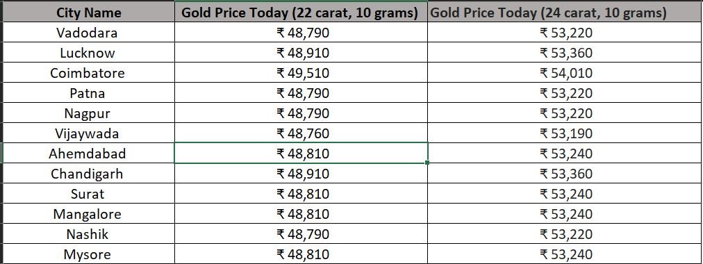 Ahmedabad: Today, the price of 22-carat gold for 10 grams costs ₹ 48,810 and 24-carat gold for 10 grams costs ₹ 53,240 in Ahmedabad. As for the price of silver, it is ₹ 612.
