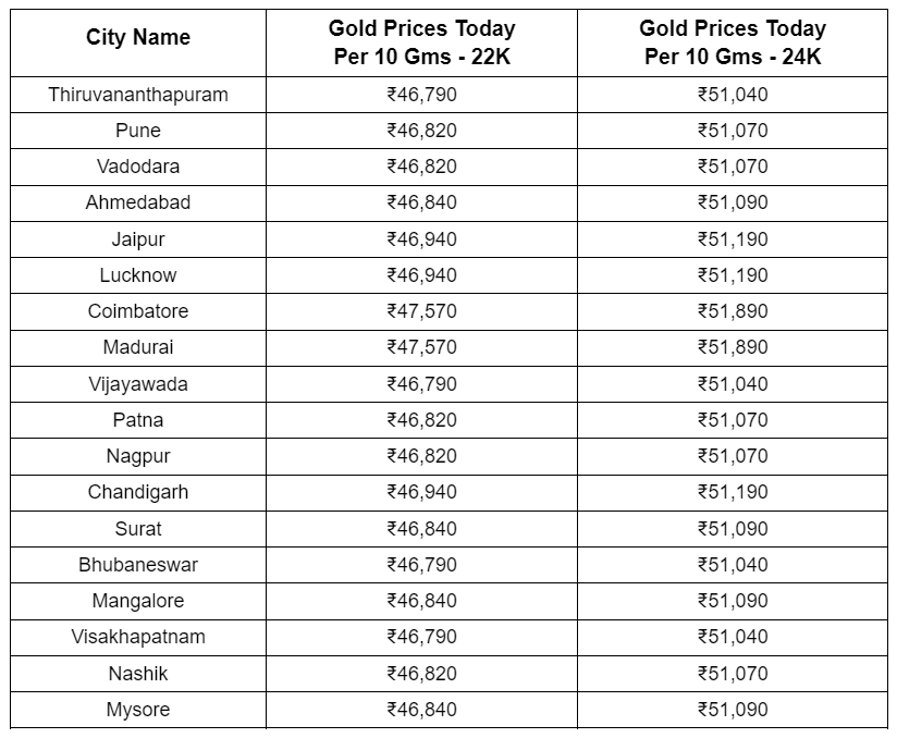 Gold Prices In Chennai - Despite the fall, the highest priced gold is still found in Chennai with 10 grams of 22K gold being worth ₹47,570, while 10 grams of 24K gold is valued at ₹51,890.