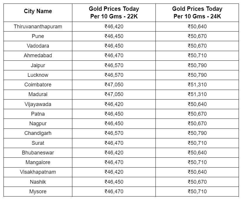 Gold Prices In Bangalore - You can buy 10 grams of 22K gold for ₹46,470 and 10 grams of 24K gold for ₹50,710 in Bangalore.