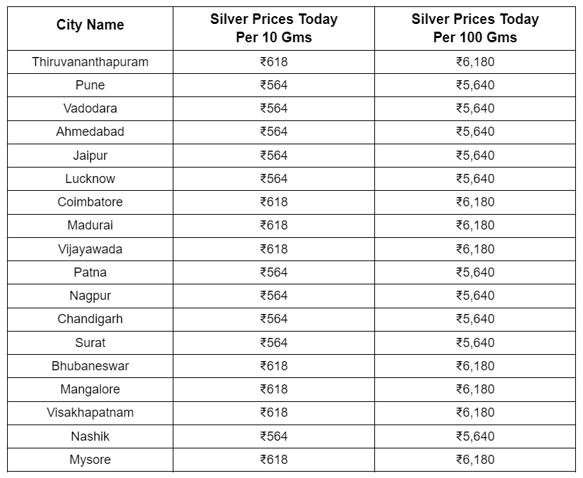Silver Prices In Mumbai - In Mumbai, 10 grams of silver costs ₹564 and 100 grams of it costs ₹5,640.