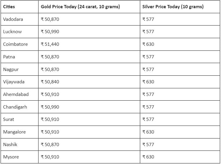 Ahmedabad: The price of gold in Ahmedabad stands at ₹ 50,910 today for 10 grams. As for the price of silver, the rate is at ₹ 577.
