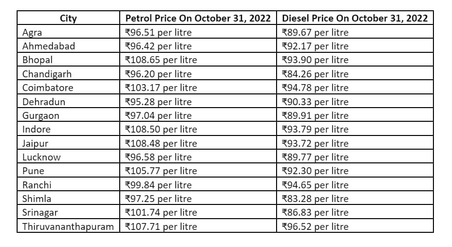 Let's look at the petrol and diesel prices in some other cities as of October 31, 2022.