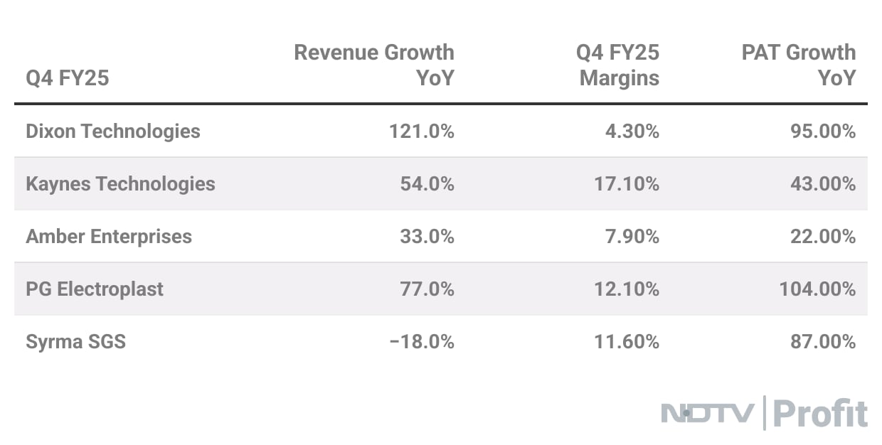 Syrma SGS Technology Ltd. and Kaynes Technologies Ltd. followed PG Electroplast and Dixon Technologies in terms of growth.
