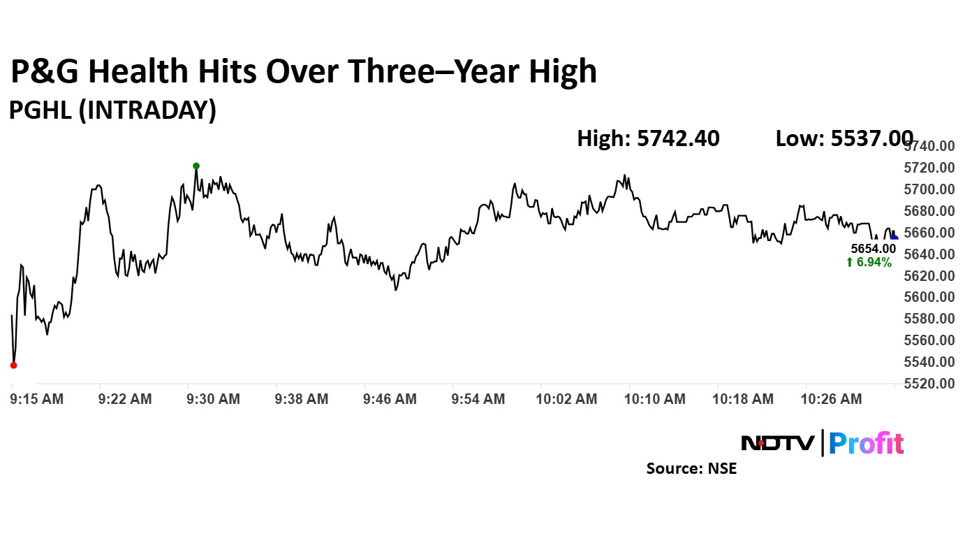 Procter & Gamble Health's share price rose 8.61% to Rs 5,742.40 apiece, the highest level since Oct. 11, 2021. It pared gains to trade 6.87% higher at Rs 5,650.00 apiece as of 10:32 a.m., compared to a 0.02% rise in the NSE Nifty 50.