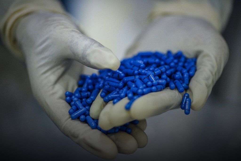 An employee holds Ramipril capsules for a photograph inside a coating unit at the Lupin Ltd. pharmaceutical plant in Salcette, Goa, India. (Photographer: Dhiraj Singh/Bloomberg)