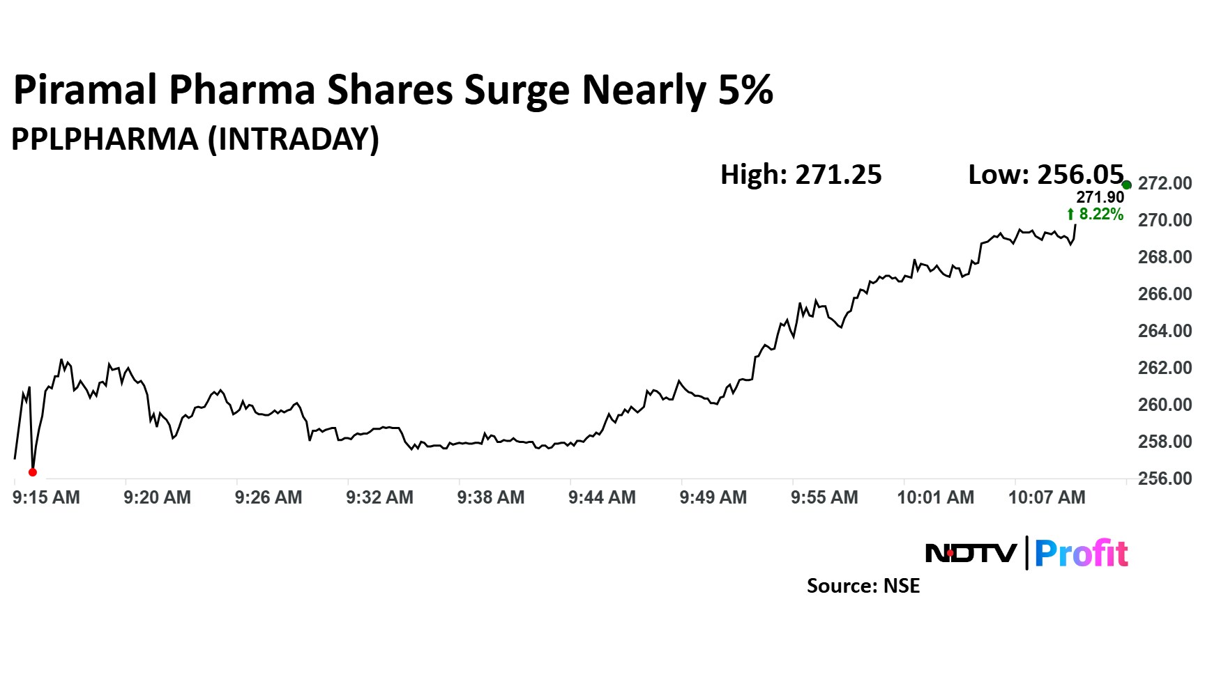 Piramal Pharma Ltd. stock rose as much as 6.07% before paring gains to trade 5.51% higher at Rs 265.10 apiece as of 9:58 a.m., compared to a 0.58% decline in the benchmark Nifty 50