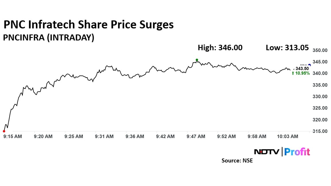 PNC Infratech stock rose as much as 11.76% during the day to Rs 346 apiece on the NSE. It was trading 10.95% higher at Rs 343.50 apiece, compared to a 0.02% advance in the benchmark Nifty 50 as of 10:09 a.m.