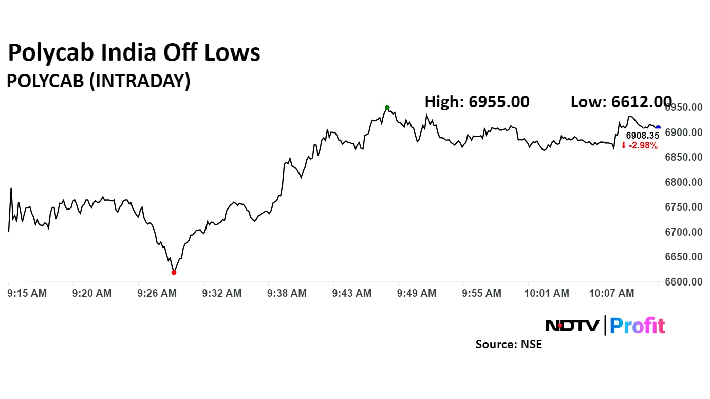 Polycab India's share price declined 7.14% before paring loss to trade 3.08% lower at Rs 6,901.25 per share as of 10:14 a.m., compared to a 0.32% decline in the NSE Nifty 50.
