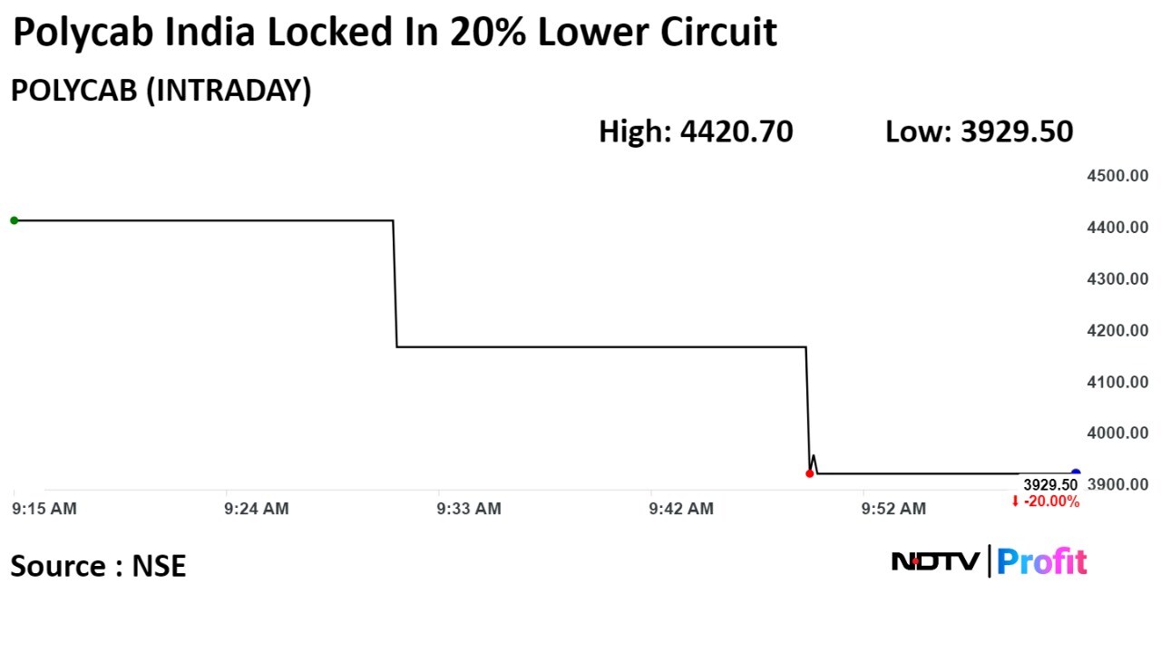Shares of Polycab India Ltd. were locked in 20% lower circuit on Thursday after the income tax department initiated search and seizure operations against the company.
