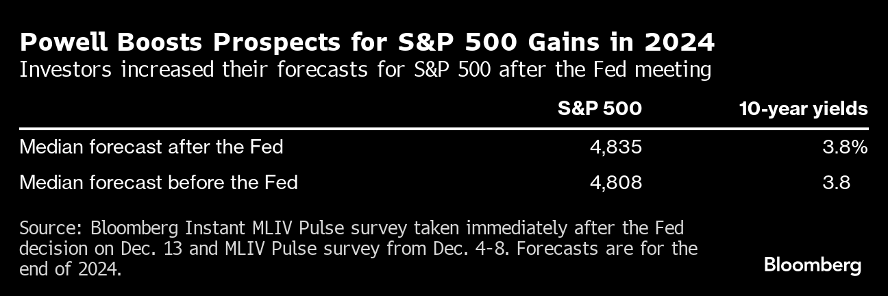 Investors expect the S&P 500 Index to rise to about 4,835 at the end of 2024, an increase compared to the last survey before the Fed decision. Still, such a gain, which amounts to about 3% from current level, reflects skepticism about how much US stocks can rally after this year's advance of almost 23%.