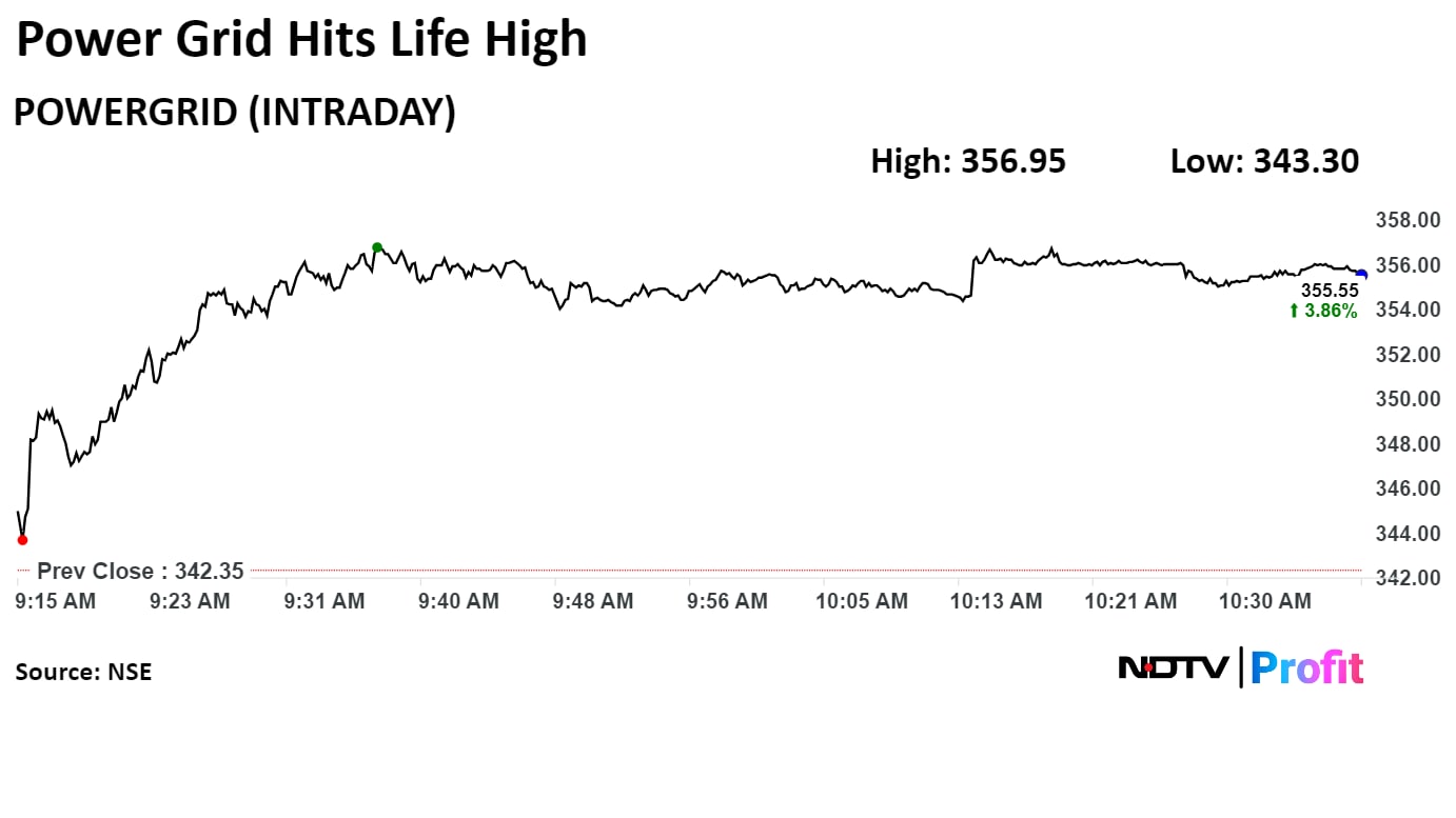 Powergrid's stock rose as much as 4.26% during the day to Rs 356.95 apiece on the NSE. It was trading 3.86% higher at Rs 355.55 per share, compared to a 0.23% advance in the benchmark Nifty at 10:39 a.m.