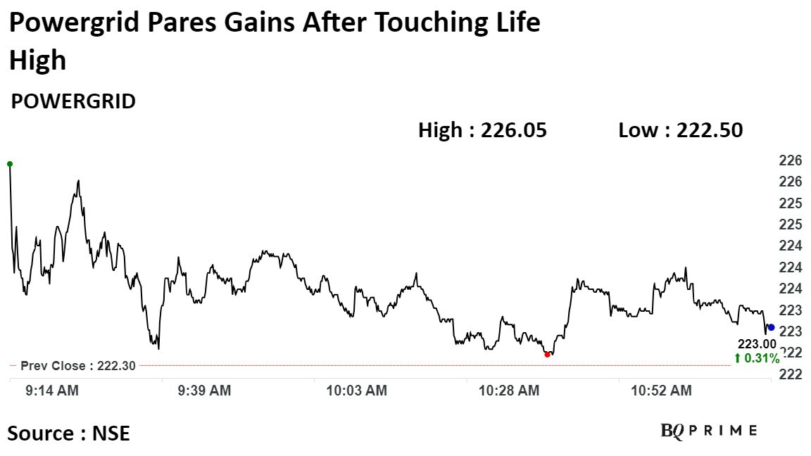 Powergrid's stock rose as much as 1.69% during the day to Rs 226.05 apiece on the NSE. It pared gains to trade 0.31% higher at Rs 223 apiece compared to a 0.36% advance in the benchmark NSE Nifty 50 as of 11:16 a.m.